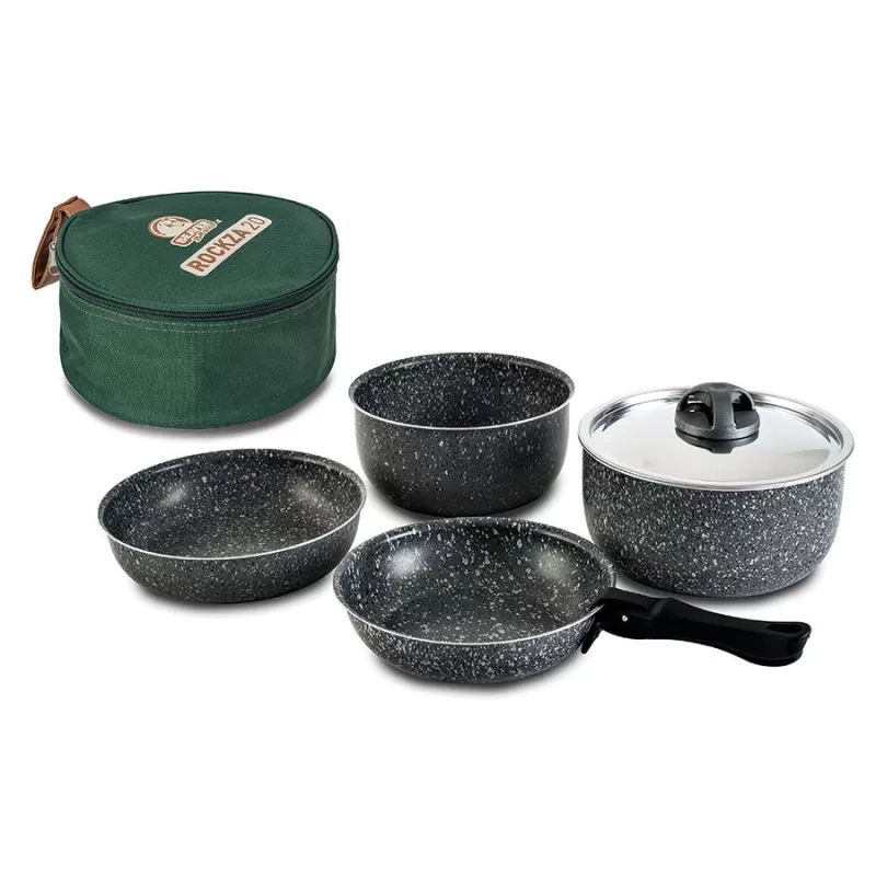 Popote en aluminium compacte pour pouvoir cuisiner comme à la maison et ranger le tout facilement dans votre camping-car ou fourgon aménagé.
