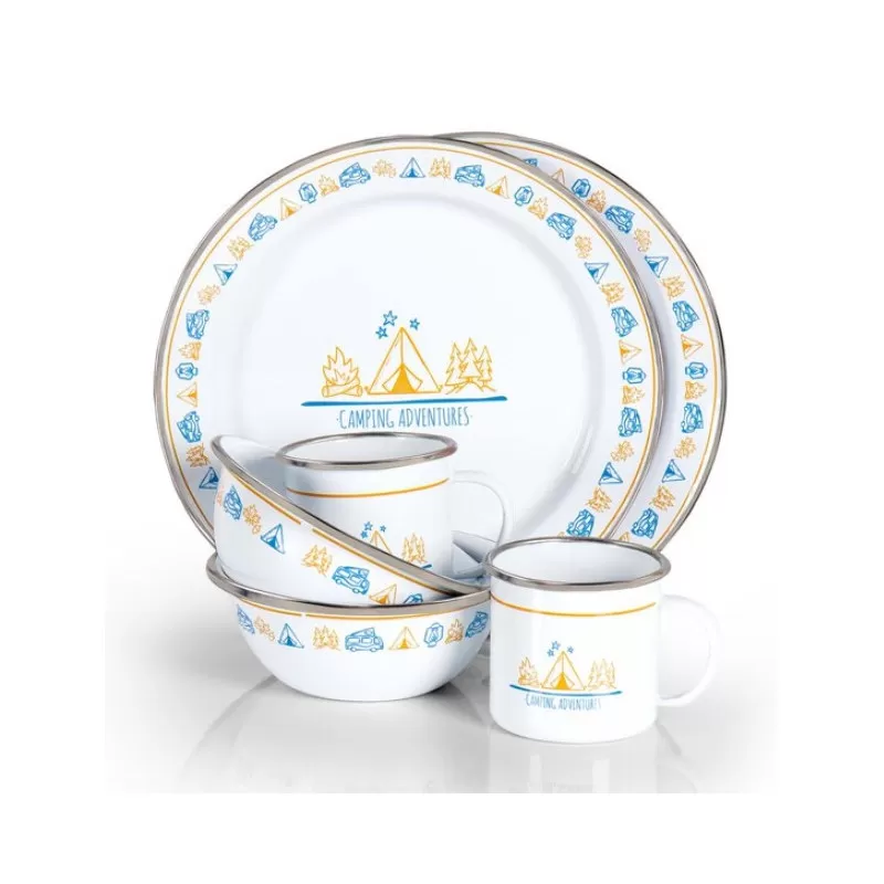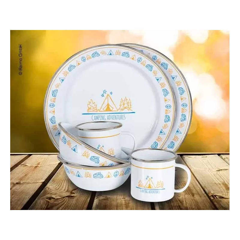 Pack, set vaisselle 6 pièces CAMP4 en émail pour l’équipement en vaisselle au camping, fourgon aménagé et camping-car. Idéal pour deux personnes.