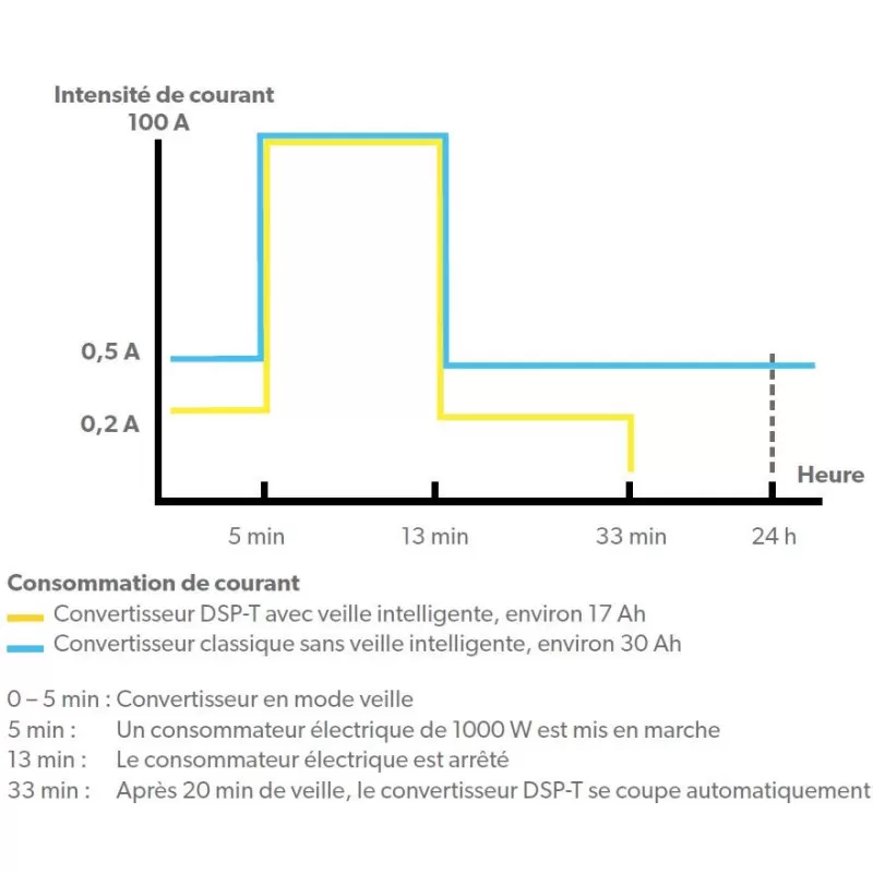 Enfin des innovations chez les onduleurs 12/230V, avec le DOMETIC Sinpower DSP à première vue il s’agit d’un convertisseur bateau et camping-car classique, ici ce transformateur intègre en plus d’une télécommande fourni, un mode veille et extinction automatique pour une réduction de la consommation.