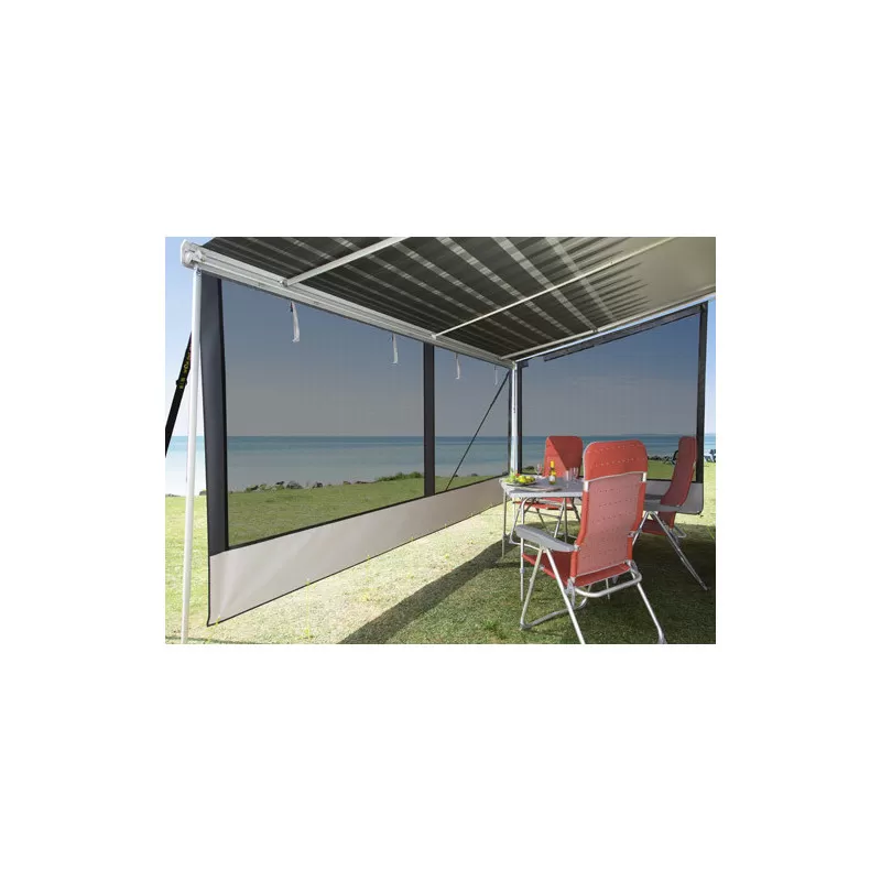 Habillage de façade de la marque DWT, cette façade est pourvu d’un tissu Mesh PVC enduit polyester, lavable, il est résistant aux intempéries et vous permettra de protéger votre campement du vent, de la pluie mais surtout du soleil.
