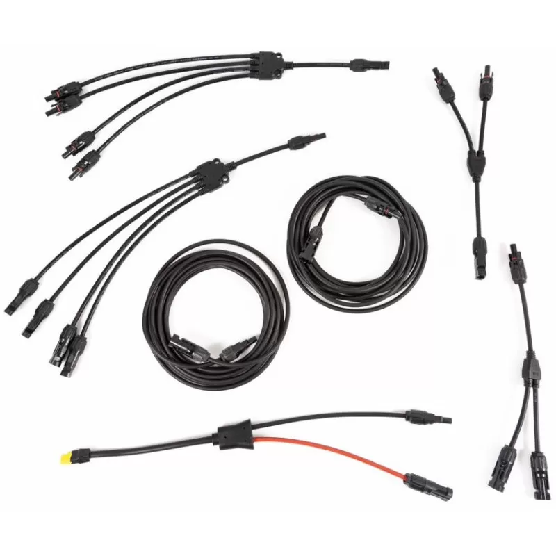 Tous les connecteurs pour raccordement 48/24/12V sont fourni, en plus sont livrés avec le panneau solaire PSP400, une paire de rallonge MC4 x 5m et un câble d’adaptation XT60 ECOFLOW.