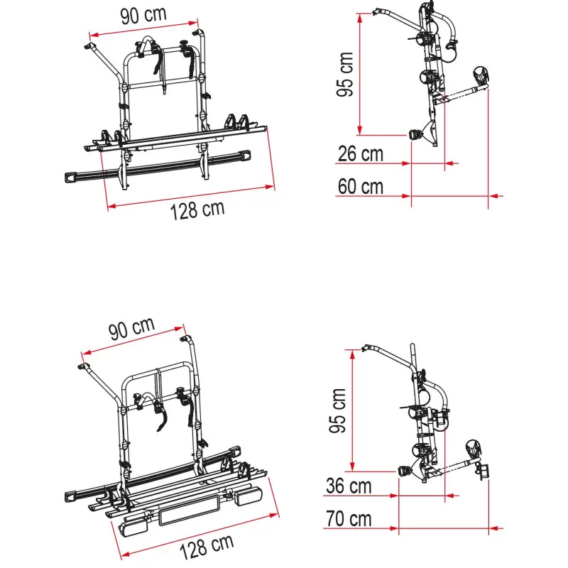 – Prévu pour 2 vélos (de série) / Pour 4 vélos (ajouter 2 rails + 2 bras en option)