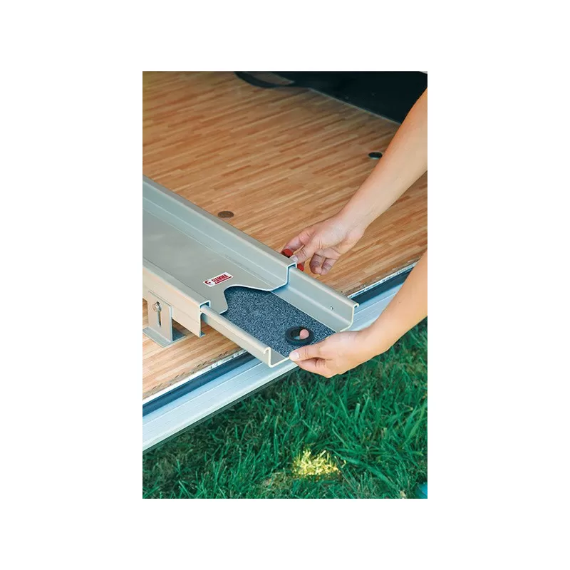 Cette version améliorée du Carry-Moto Pro FIAMMA offre désormais une bande anti-dérapante sur la rampe de chargement et des pattes de fixation au plancher réglables en hauteur ! Le produit en lui même est composé de deux rails aluminium anodisé robuste et léger.