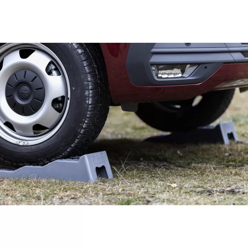 La référence de la cale roue pour la mise à niveau des camping-cars, caravanes, vans et fourgons aménagés ! Le Level Up de FIAMMA est livré en paire de 2 cales coloris noir (gris anthracite) sur 3 niveaux pour s’adapter à tous les sols !