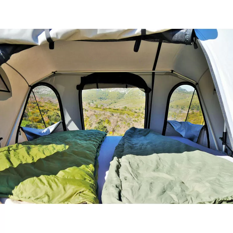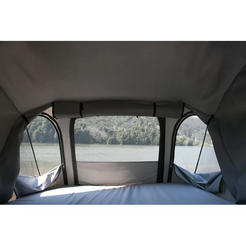 Conçue pour 2 à 3 personnes (2 adultes et 1 enfant), la tente souple renferme un matelas haute densité de 28kg/m² de 140 x 200 cm. Le matelas reste en place au moment de la fermeture de votre tente de toit JAMES BAROUD.