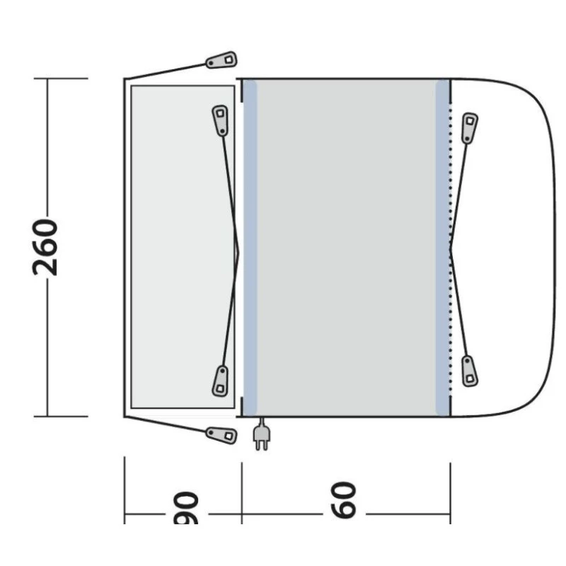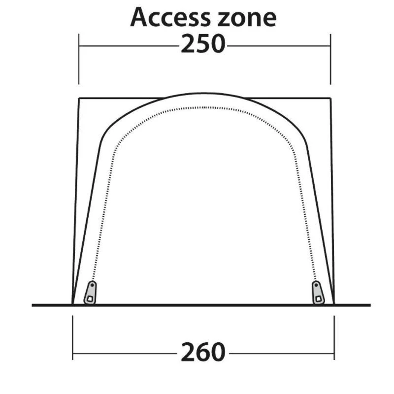 L’armature en tube pneumatiques individuels se gonflent séparément grâce à des valves accessibles. Le tapis de sol intégré permet un accès propre et stop les courants d’air et la pénétration des insectes rampants. Des crochets à l’intérieur du auvent, vous permettent de venir suspendre des câbles ou des accessoires légers et est doté d’un passe câble.