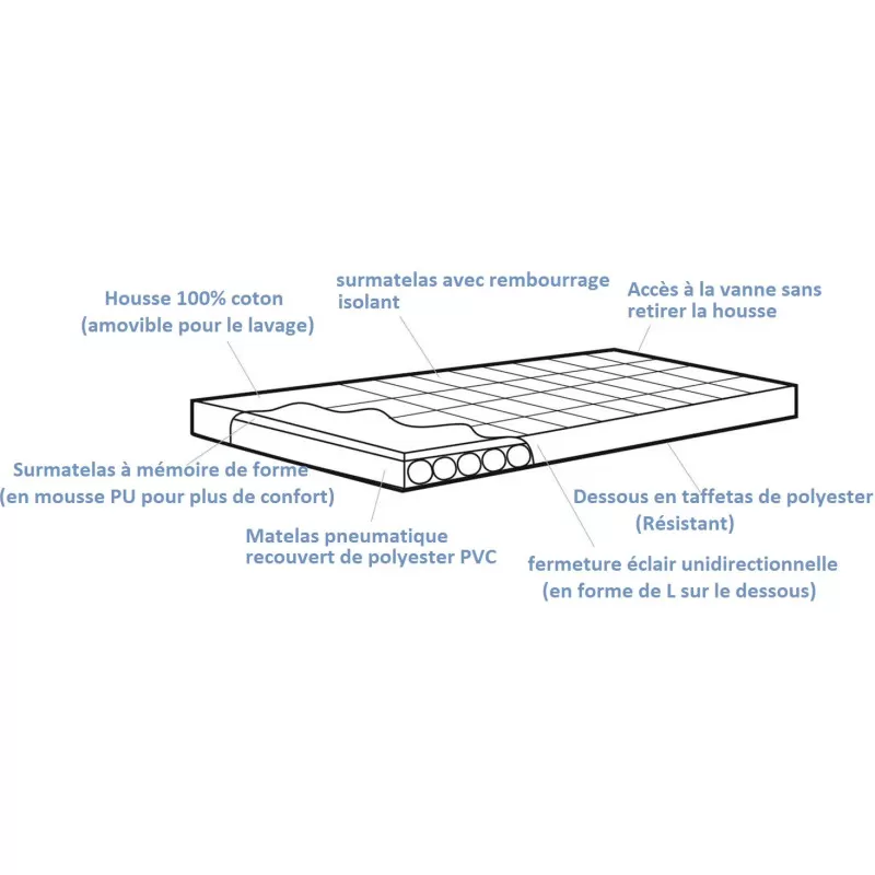 - Matelas pneumatique : 100% polyester pongé 190T 75D – Housse – Dessus : 100% coton – Dessous : taffetas polyester 68D