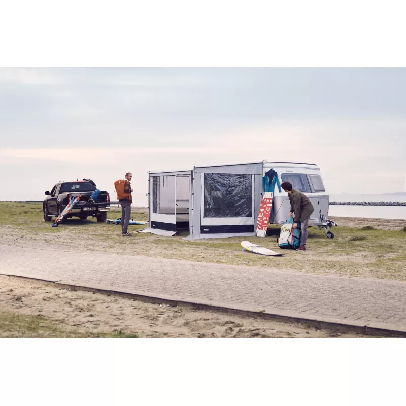La gamme d’auvent complet de chez THULE s’agrandit et il est possible désormais d’opter pour un auvent entièrement clos pour la célèbre gamme ERIBA Touring. Vendu complet, cet auvent de caravane est doté d’une façade ainsi que de côtés permettant une fermeture totale de votre auvent extérieur. Résistant, solide, il vient se fixer directement sur votre store extérieur de toit THULE 6300.