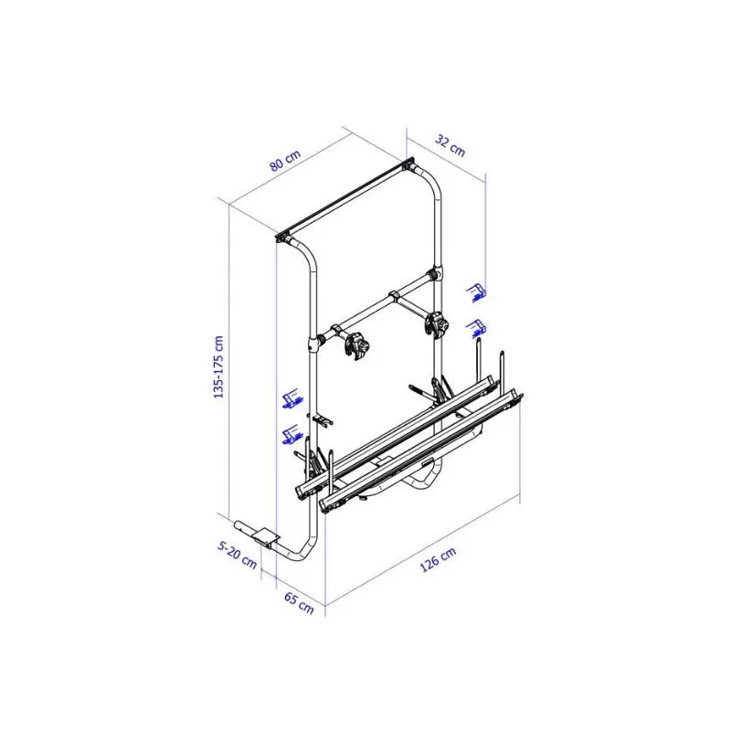 La particularité de ce porte-vélos est que son cadre télescopique est conçu pour se fixer en haut, sur la paroi arrière de la caravane, et en bas sous le châssis de cette dernière. Très pratique donc lorsque la paroi arrière est limitée en place notamment à cause de la présence d’une baie vitrée ou d’un pare-choc conséquent.